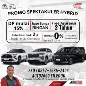 Jika Anda sedang mempertimbangkan untuk beralih ke kendaraan hybrid, ini momen yang pas. Toyota Hybrid (HEV) menawarkan performa responsif, kabin nyaman, dan efisiensi yang lebih baik untuk penggunaan harian maupun perjalanan keluarga. Segera manfaatkan promo Toyota Hybrid Ciledug DP 15%, bunga 0%, dan free asuransi 2 tahun sebelum periode promo berakhir. Hubungi tim marketing untuk cek ketersediaan unit, simulasi kredit, dan syarat ketentuan promo yang berlaku.